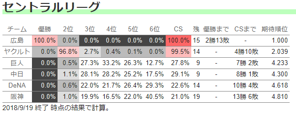 この「プロ野球 順位確率」ページは、元々カープ応援ページの一部でしたが、今や、カープファンだけでなく、多くのプロ野球ファンに親しんて頂いております。これは本当に喜ばしいことであり、また、本物の統計データに価値を感じて下さる皆様に感謝しております。