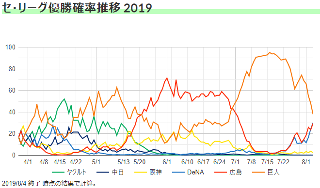 ただ、直感と比べてみて下さい。7月18日時点の巨人が「このまま行けば95%優勝する」勢いだったのは、多くの方の感覚とも一致するのではないでしょうか。そして、今、8月4日の状況が「巨人が有利なものの、3チームに可能性がある」というのも、感覚と違うという方は少ないと思います。もちろん、阪神ファンはまだ優勝に絡む可能性を諦めてはないでしょう。