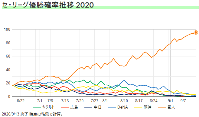 それでも、週間天気予報や長期予報を、災害への備えや休暇の過ごし方の計画に役立てられる人が居るように、この優勝確率も、その性質を分かっている皆さんの応援の役に立てて貰えればと思います。特に、優勝決定日確率は、遠征計画のお役に立てればと思って計算を始めました。