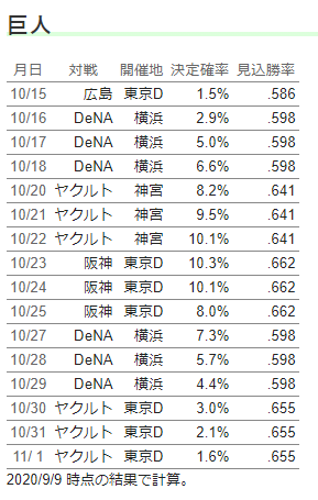 また、個人的に感じる傾向として、早期の確率分布からは、実際の優勝決定日が「若干後ろにずれ気味」になります。理由の一つに雨天順延による日程の変更がありますが、もっと大きな要因は、優勝が決定的になる時というのは、だいたい勝ちが続いた時になります。その後、そのペースが少し落ちたり、優勝目前で足踏みする事があれば「それまでのペース」よりも若干優勝が遠ざかり、決定日が後ろにずれます。