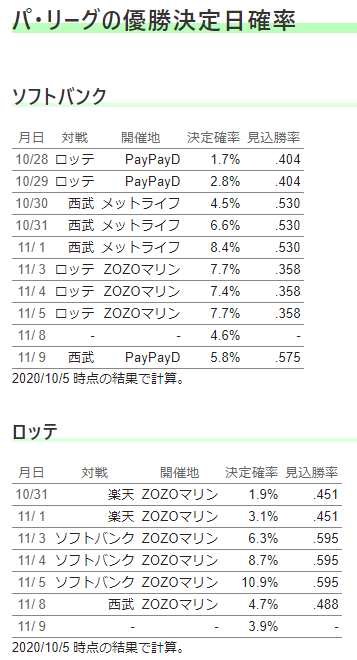 最終盤の西武戦まで持ち込めば、西武に勝てていないロッテに不利となり、西武が勝つことでソフトバンクの優勝が決まるシナリオの可能性も数パーセント出てきました。